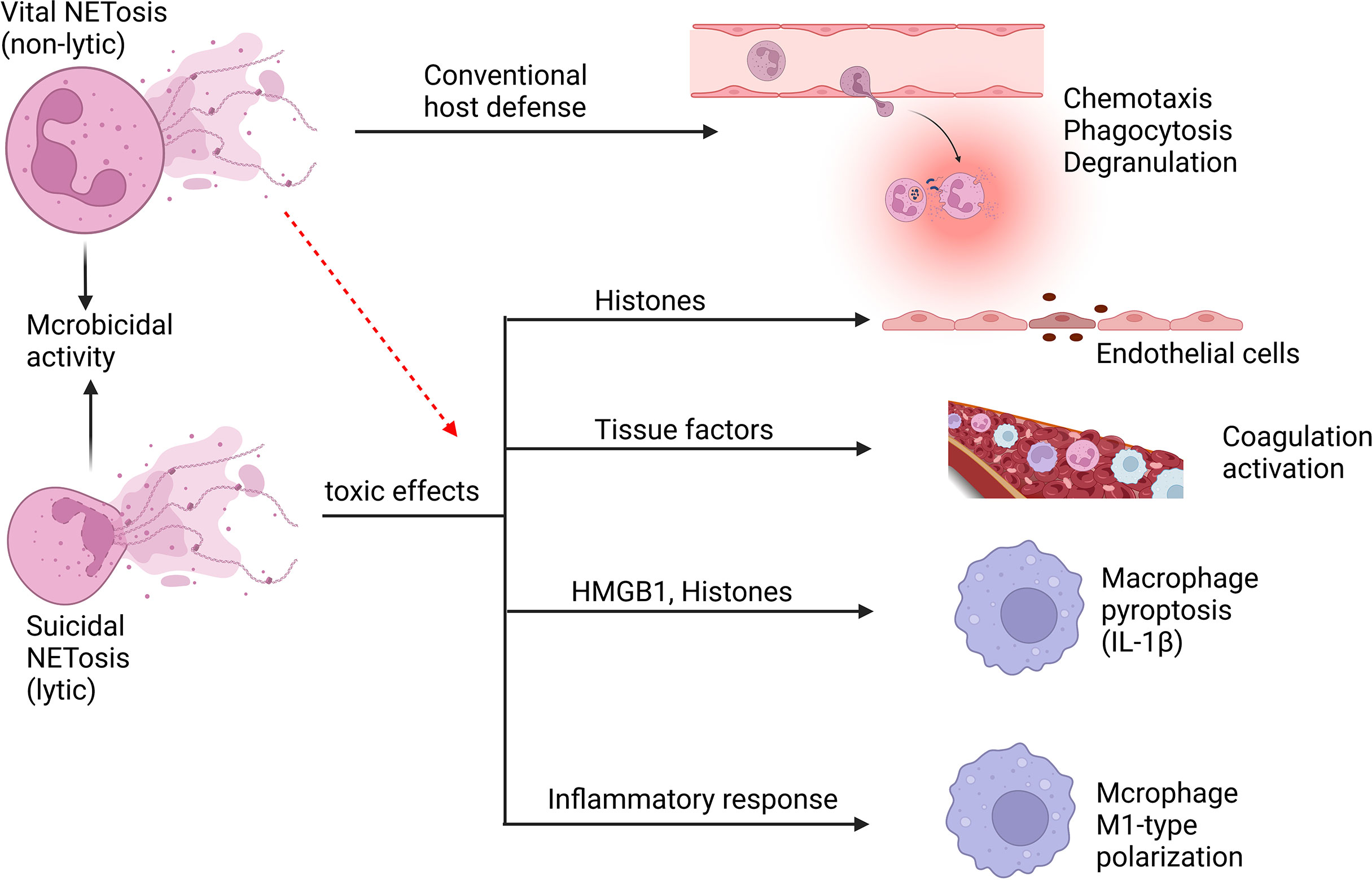 When neutrophils release NETs in a process called ETosis, this causes pyroptosis, a very inflammatory and explosive way of cell death to keep a pathogen at bay. R
