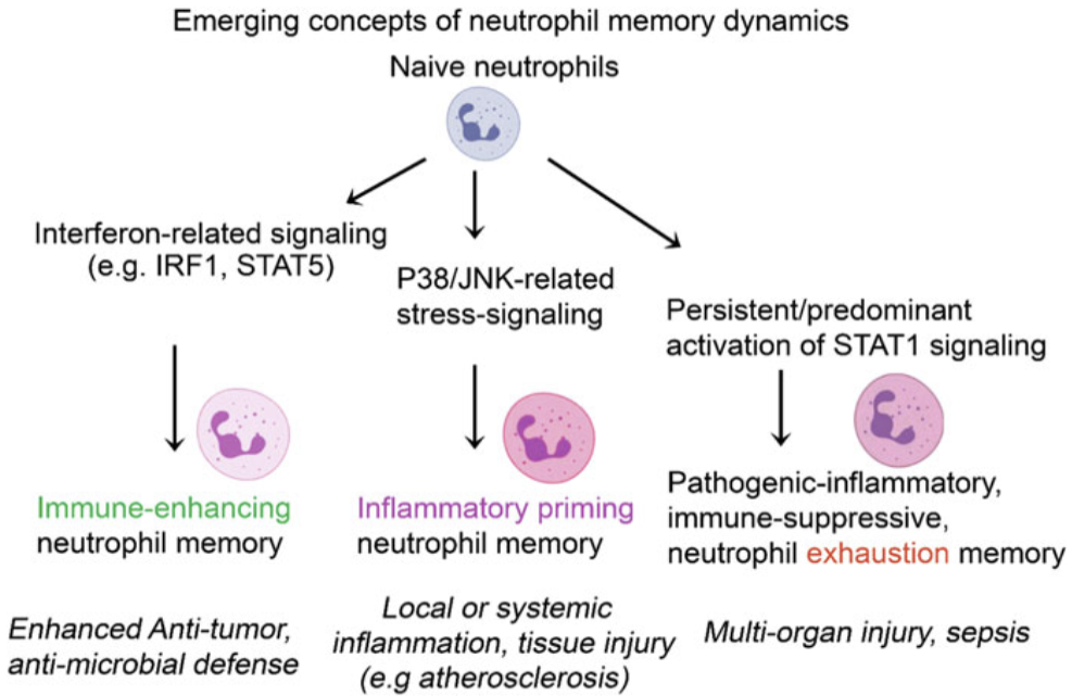 After microsepsis, neutrophils can get in an exhausted state: pro-inflammatory and immunosuppressive.