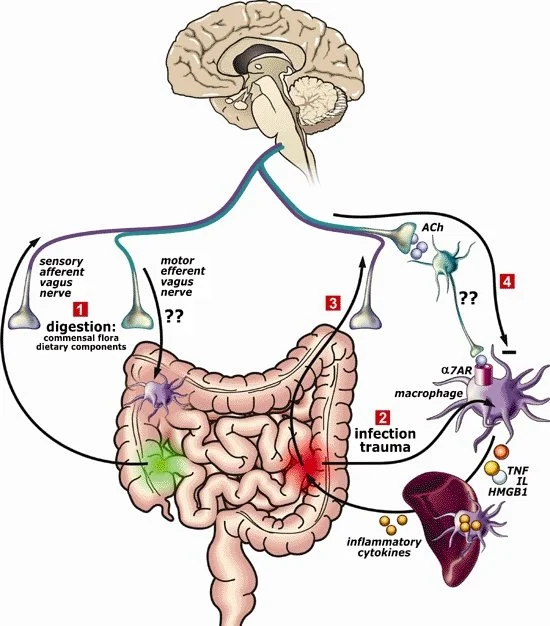 Without proper a7nACHR activation, macrophages do not produce their phagocytotic ability to clean up debris, and the vagus nerve, which is highly cholinergic, cannot relax and get into a parasympathetic state. R